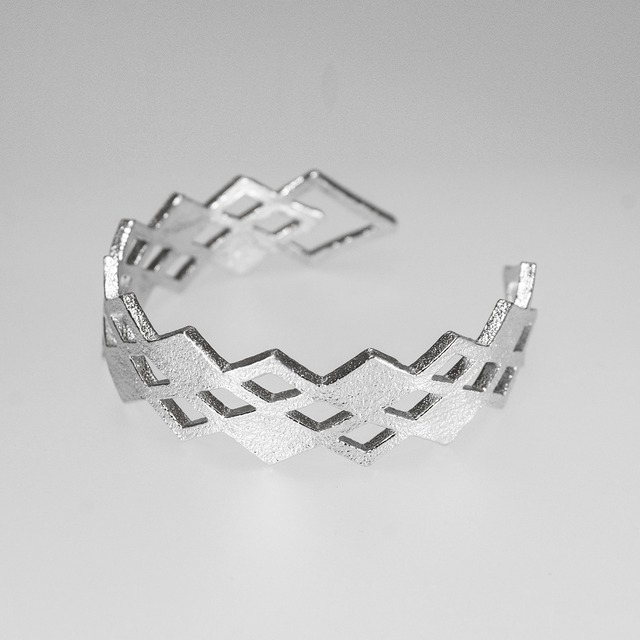 クチナワとは小さな蛇を示す古語で、朽ちた縄に似ていることに由来しています。人と蛇は古来から縁が深く、各国の神話に登場し、古代エジプトの時代からジュエリーのモチーフとされてきました。KUCHINAWAは一見すると美しい菱形模様の装飾ですが、真俯瞰の蛇の図柄が秘められたユニークな腕輪です。 素材:錫99.9% 寸法:約18x175x2.5mm 重さ:約29.0g #アクセサリー #ジュエリー #ハンドメイド #バングル #ブレスレット #錫 #ギフト #鋳造 #スズ #デザイン #シンプル #ミニマリスト #アクセ #ブレス #装飾 #フリーサイズ #シルバー #モダン