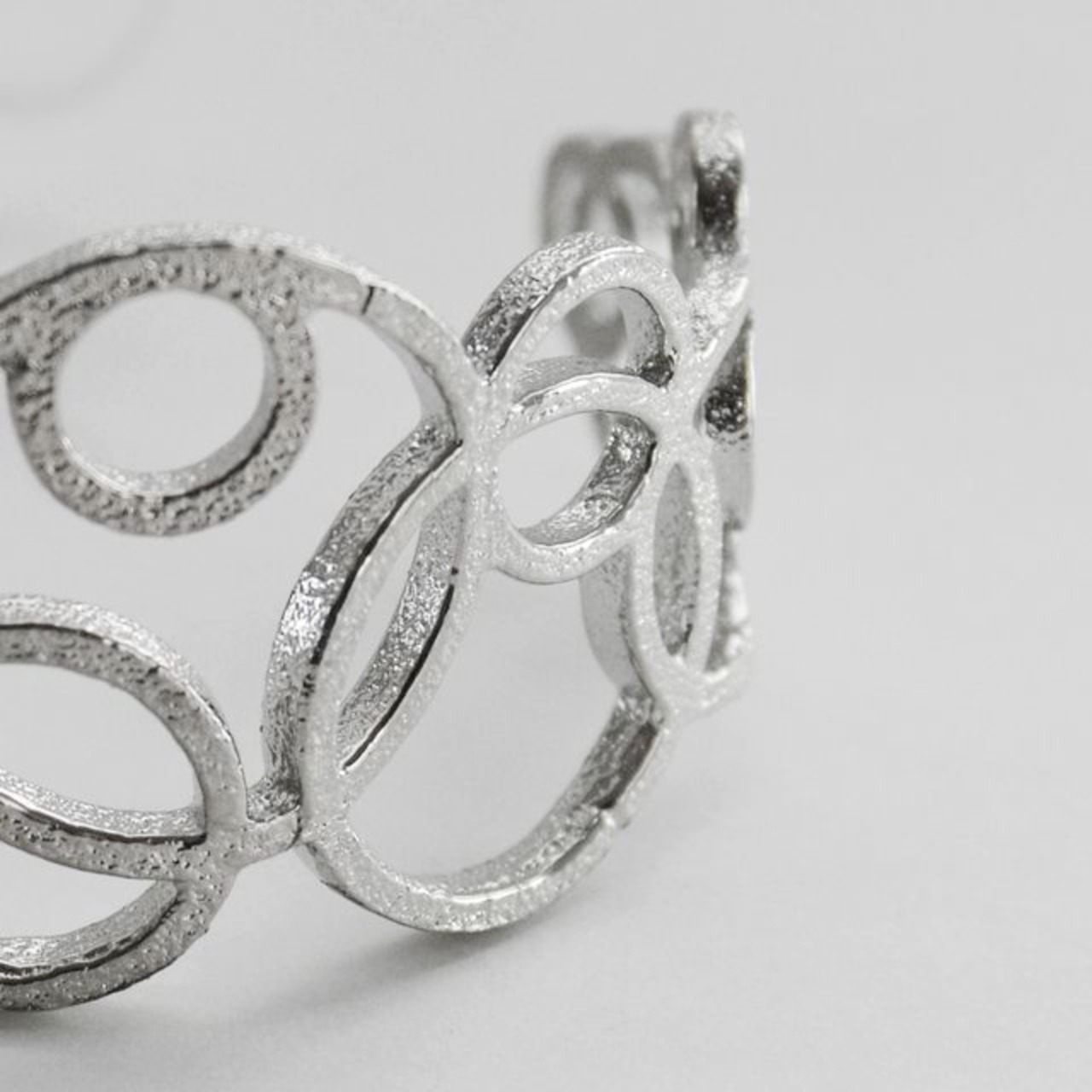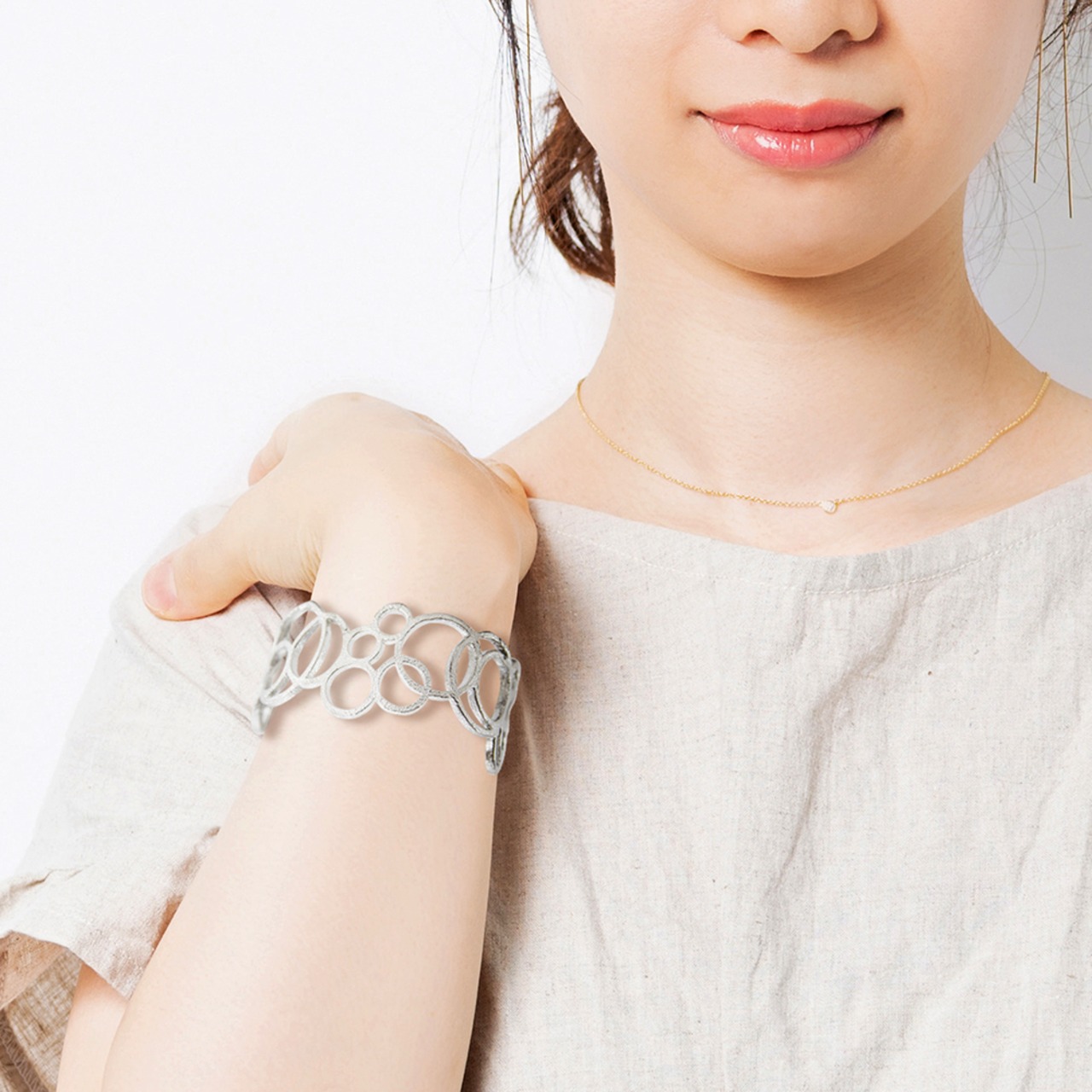 水中に潜む生物が吐き出す呼気や、水底から湧き上がる湧水の気泡。マグマの熱で沸騰した源泉の水蒸気の泡。ABUKUはそのような水中を立ち昇る泡(あぶく)をイメージしたデザインです。たくさんの円で構成されたデザインと約30mmの幅広の造形が、確かな存在感と優美で繊細な印象を与えます。