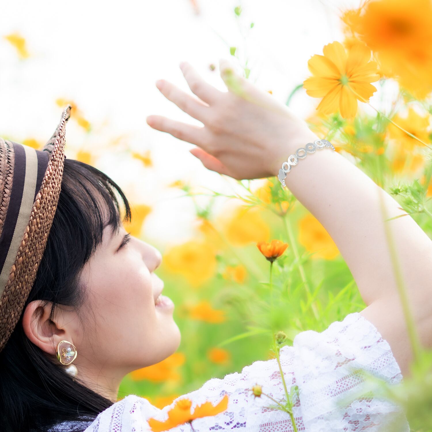 小さな正円と輪が連なるデザインは、山や谷で声が方々に反響する木霊(こだま)と、古代日本の首飾りや腕飾りで用いられた小玉(こだま)というガラス玉をモチーフにしています。軽量で細身のバングルは、手もとにさりげない装飾と気品を与え、日常使いはもちろん、フォーマルな装いにも合わせられます。